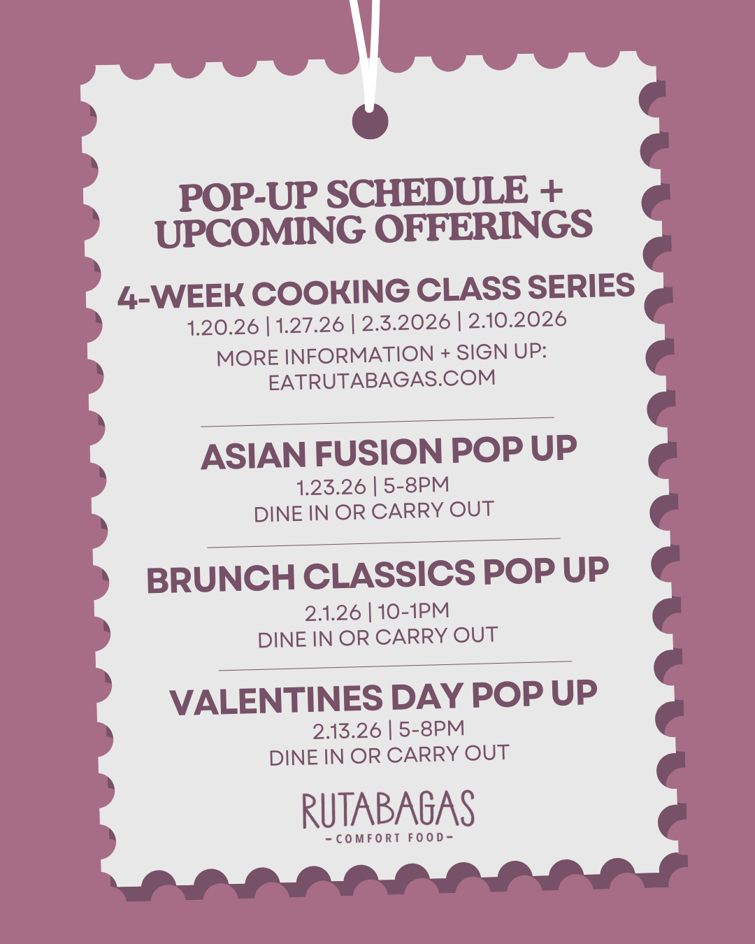 Effective Jan 4th, 2026, Rutabagas will be a pop-up only style concept and the restaurant will be closed to the public. Stay tuned to Instagram, our email newsletters and this webpage for upcoming pop ups, cooking classes, and more!