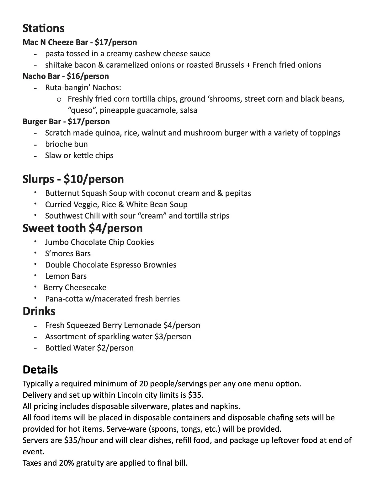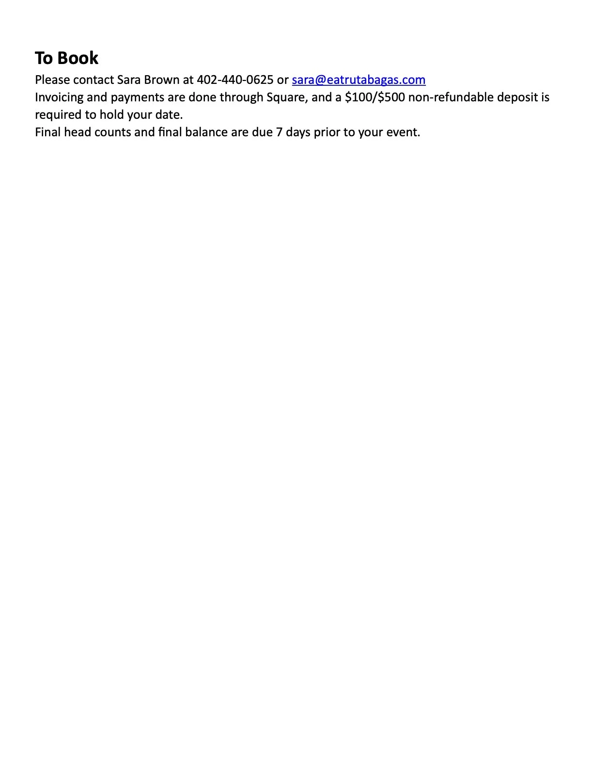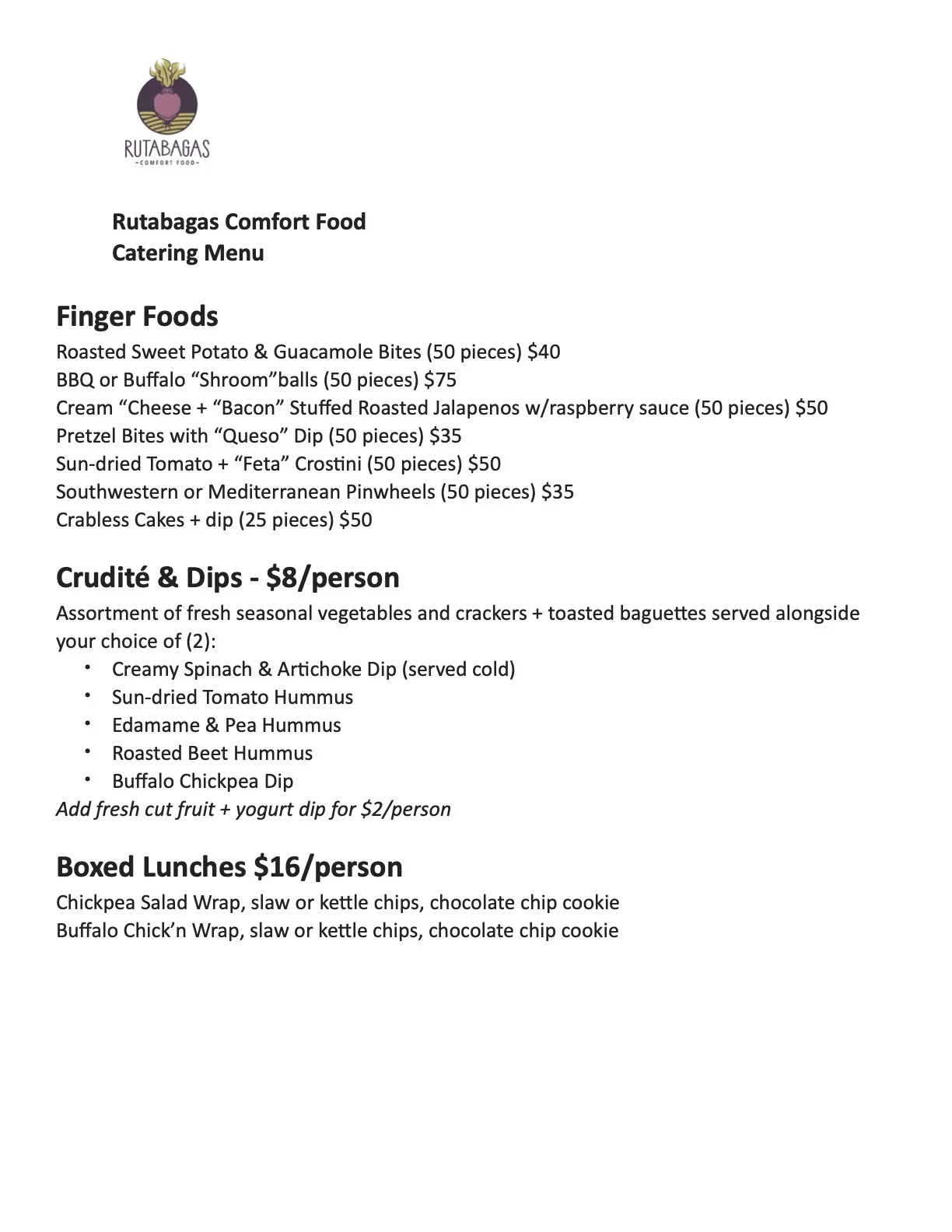 Email us to schedule a time to chat! hello@eatrutabagas.com and we can send over our catering menu with more details!